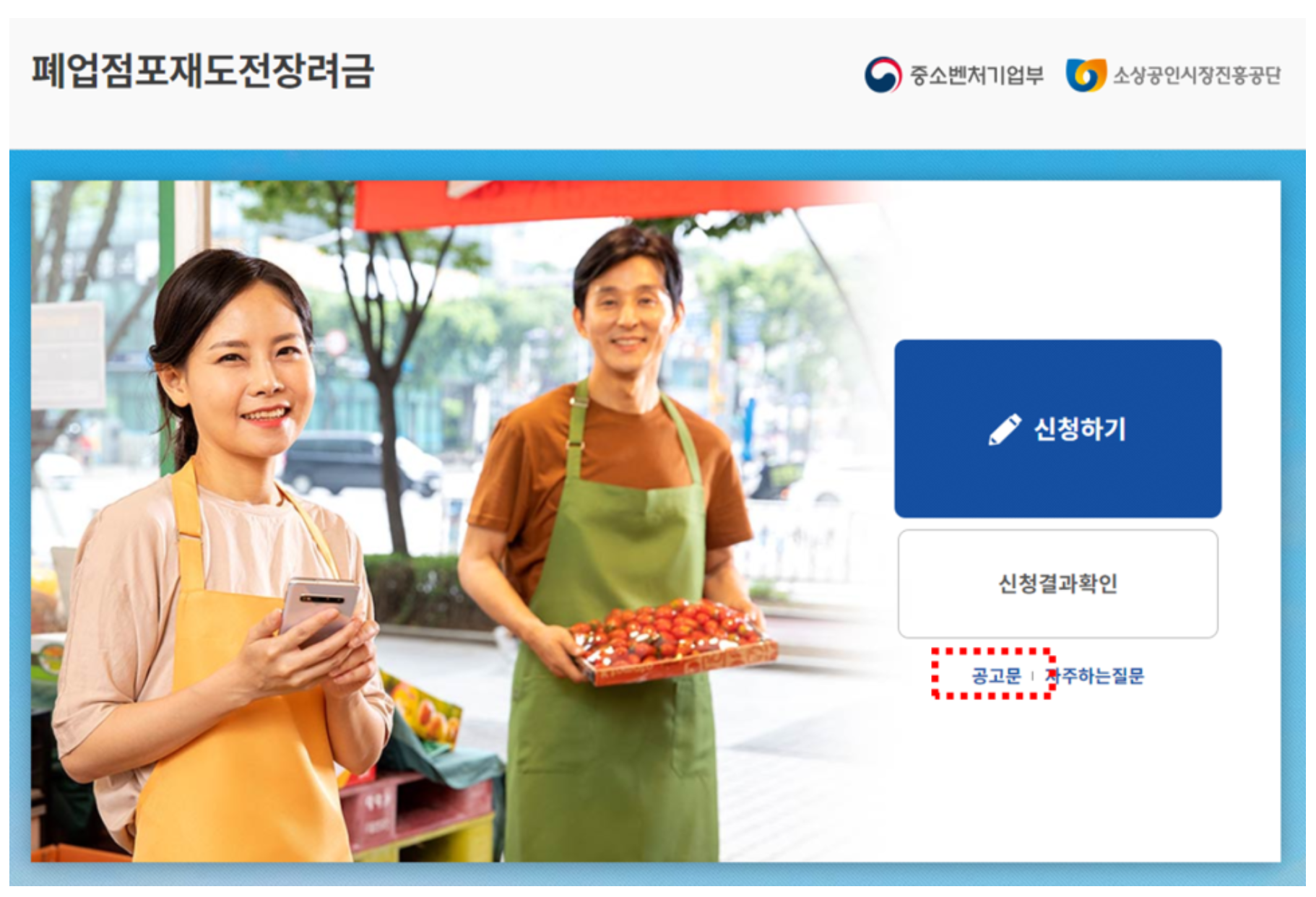 신청시 필요한 서류 및 소상공인 기준 확인은 폐업점포 재도전장려금 누리집 접속 후 [공고문]에서 확인 가능합니다.