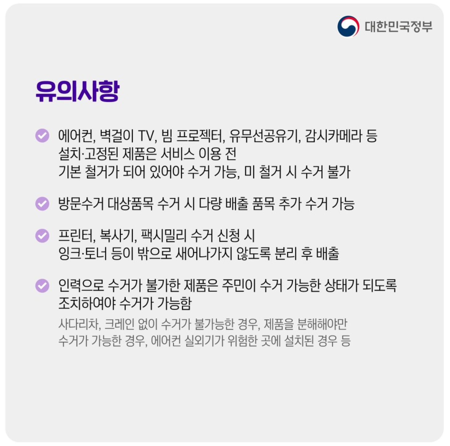 - 설치·고정된 제품은 기본 철거가 되어 있어야 수거 가능