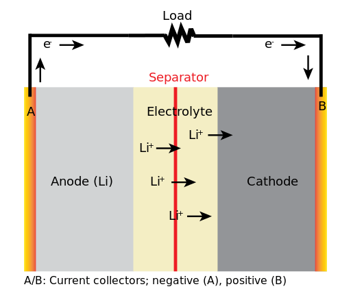 이온의 이동이 일어나는 매개체. 주로 액체(수용액), 리튬 (유기용매_이온전도도 수준: 10^-3 s/cm)