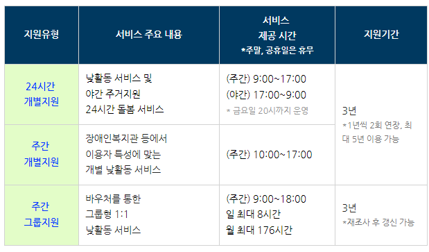 돌봄 서비스는 24시간 개별지원, 주간 개별 지원, 주간 그룹 지원으로 나뉘는데요.