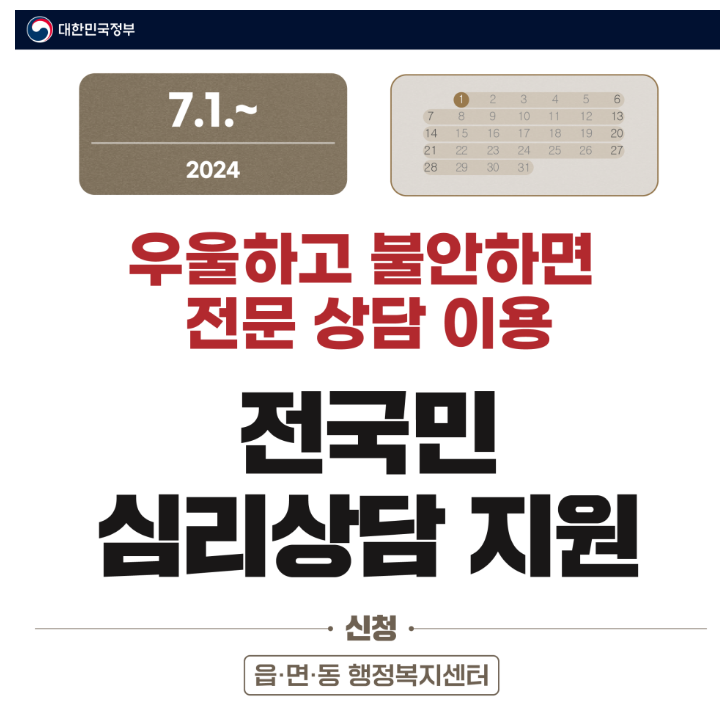 7월 1일부터 우울, 불안으로 어려움을 겪는 국민에게 전문 심리상담 이용권을 제공합니다.